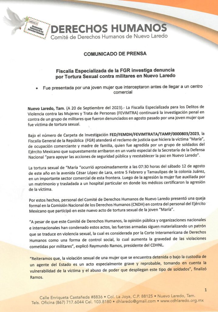 Por estos hechos, personal del Comité de Derechos Humanos de Nuevo Laredo presentó una queja formal en la Comisión Nacional de los Derechos Humanos (CNDH) en contra del personal del Ejército Mexicano que participó en este nuevo acto de tortura sexual de la joven “María”.