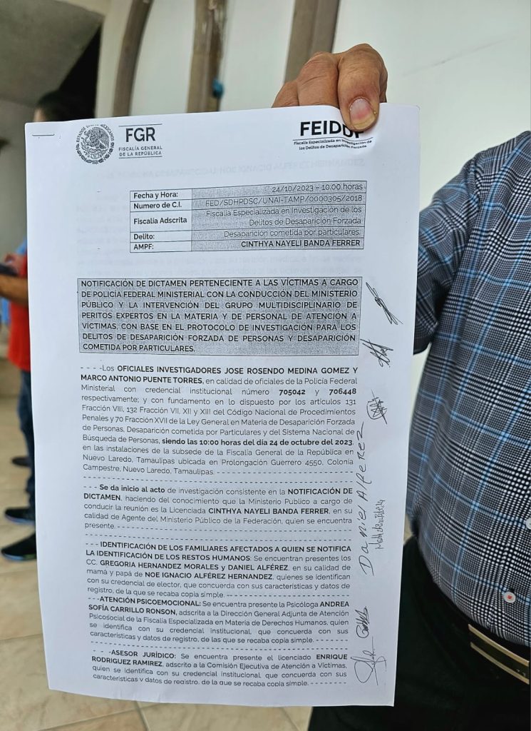 Nuevo Laredo, Tamaulipas. A 24 de octubre del 2023.- La Fiscalía General de la República (FGR), delegación Nuevo Laredo, notificó que fueron identificados dos cuerpos mediante pruebas genéticas, confirmando la muerte de Noé Ignacio Alférez Hernández y Jonathan Ballesteros Loaiza; ambos desaparecidos desde el 17 de febrero del 2018, en manos de elementos de Secretaría de Marina (SEMAR).