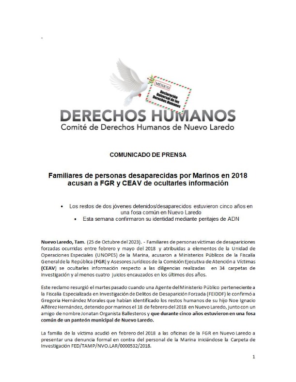 Nuevo Laredo, Tamaulipas (27 de Octubre del 2023). – Familiares de personas víctimas de desapariciones forzadas ocurridas entre febrero y mayo del 2018 y atribuidas a elementos de la Unidad de Operaciones Especiales (UNOPES) de la Marina, acusaron a Ministerios Públicos de la Fiscalía General de la República (FGR) y Asesores Jurídicos de la Comisión Ejecutiva de Atención a Víctimas (CEAV) se ocultarles información respecto a las diligencias realizadas en 34 carpetas de investigación y al menos cuatro juicios encauzados en los últimos dos años.