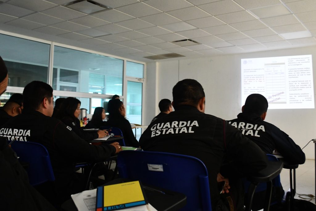 Ciudad Victoria, Tamaulipas.- En apego al compromiso de capacitación policial permanente de la Secretaría de Seguridad pública de Tamaulipas (SSPT), personal de la Guardia Estatal atendió el curso-taller ‘’Derechos Humanos y llenado del Informe policial Homologado’’ impartido por personal de la Fiscalía General de la República (FGR).
